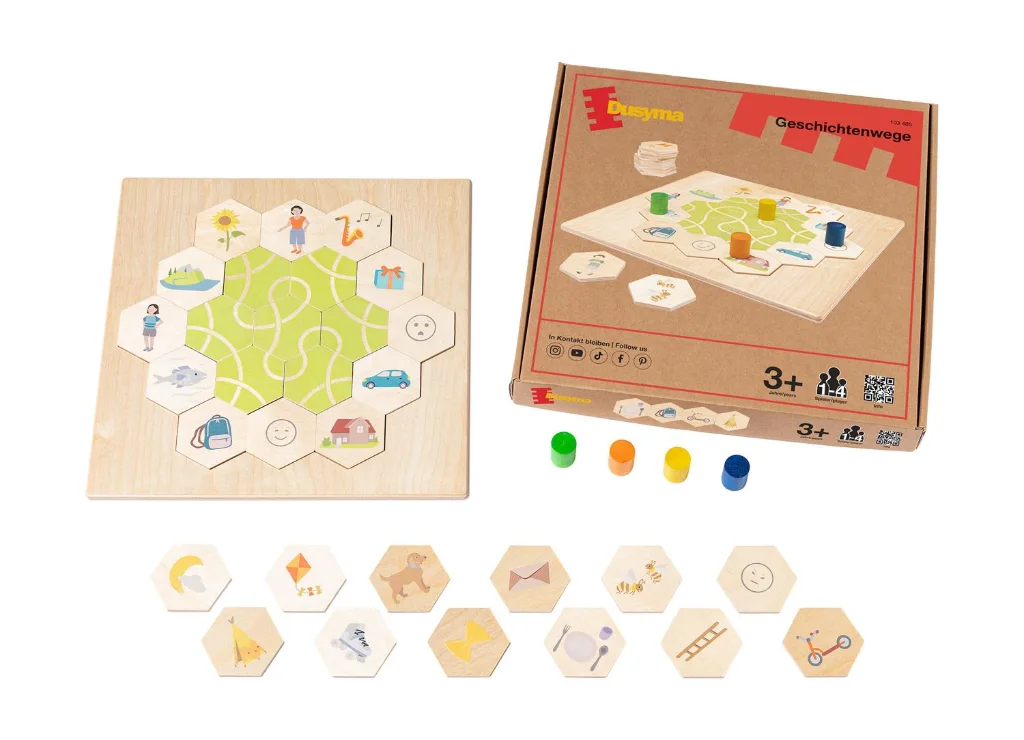 Mit Geschichtenwege wird Erzählen zum Abenteuer: Kinder entdecken spielerisch Sprache, erweitern ihren Wortschatz und erleben, wie Geschichten entstehen. Das Spiel verbindet Kreativität, Sprachförderung und gemeinsames Lachen – ein wertvolles Werkzeug für pädagogische Arbeit und für zu Hause.